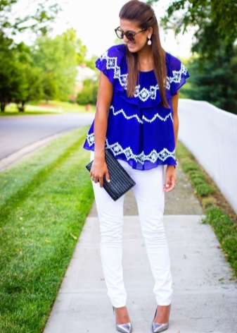 Fashionistas often choose a combination of silver and white with a gray-blue tint. In this outfit, you can feel cool even on the hottest days. Snow-white trousers and a gray-blue top look spectacular with silver shoes. A good completion of a stylish bow will be a handbag in the tone of a shoe or top.