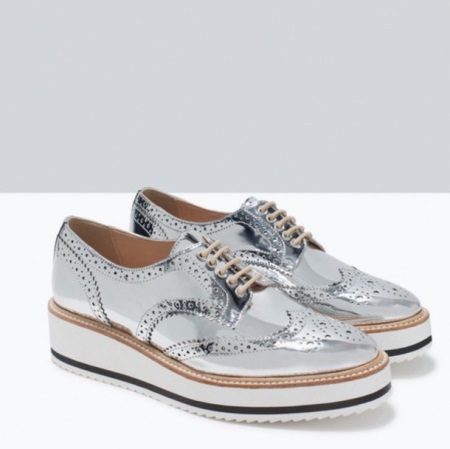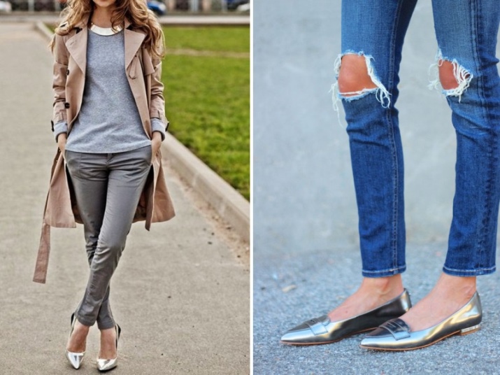 Very comfortable and popular shoes for everyday wear are silver low-heeled shoes. Often there are loafers or ballet flats. They can be safely combined with your favorite jeans, trousers, shorts and even dresses.