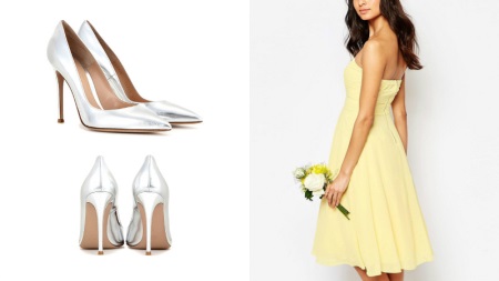 You can use different shades of yellow - ranging from bright to pastel colors. To give an image of lightness, silver-colored shoes with transparent inserts are the ideal solution.