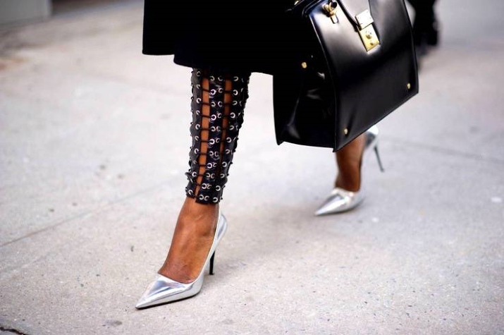 Silver looks good with black. Such a tandem is suitable for the embodiment of stylish images in different styles. Black clothes look advantageous against the background of silver shoes due to the contrast.