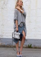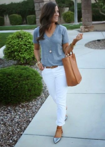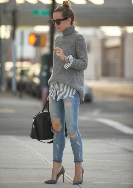 Gray suede pumps with a pair of skinny jeans are a great outfit formula to have in your arsenal. This ideal union can be supplemented endlessly and in a wide variety of ways. For a small business trip, you can add a gray slim cardigan with a throat in combination with a cotton shirt and a gray longitudinal strip. It turns out a soft, but effective neat image. The bag does not have to be in the same tone as the shoe. Black color in accessories will be optimal and add a little elegance to the image. If desired, if it is hot on the way, the sweater can be removed. Jeans, a shirt and gray pumps create a light, fresh look, which is very important if you are on a long journey.