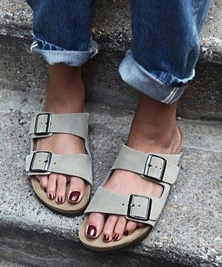 Orthopedic open sandals-birkenstocks won the hearts of fashionistas thanks to wearing comfort, stylish appearance and versatility of style. With such light gray sandals you can create a very delicate and romantic look.