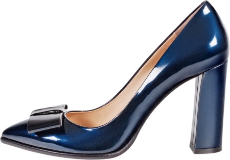 - Lacquered pumps with medium heels are designed specifically for office workers. The business image with these shoes is fascinating. The model looks quite conservative, due to which the onion looks restrained, and the dark blue color and varnished surface add originality and freshness.