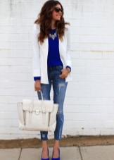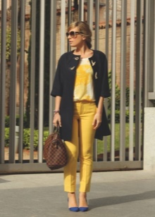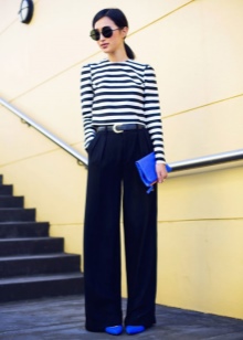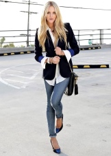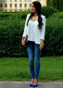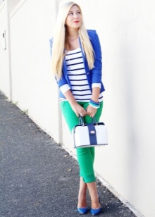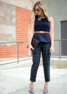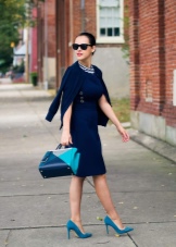 Blue high-heeled and medium-heeled shoes look very stylish in combination with business trouser suits. Deep-colored shoes are in perfect harmony with formal shirts and blouses made of sliding fabrics, complemented by business jackets. Skinny pants in tandem with blue pointed shoes with medium or high heels emphasize the slenderness of the legs and visually stretch the figure.