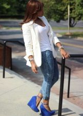 To create an effective look for every day, blue platform shoes and high heels can be combined with ripped jeans. Sea-colored shoes look perfect in combination with light blue jeans. A snow-white t-shirt decorated with a black print and a white jacket are ideal for embodying an unforgettable image. Clothing in calm colors emphasizes the brightness and color saturation of shoes.