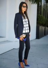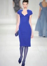 With shoes in a bright shade of blue, business clothes in dark colors will ideally look. For example, a sheath dress in black or dark blue will be an excellent solution. In cool weather, the image can be supplemented with tights and a bright red coat.