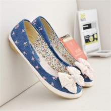 Blue shoes decorated with bright prints look fresh and bold. Multi-colored patterns on a blue background will bring new colors to the image, and will also become a bright accent in a fashionable bow.