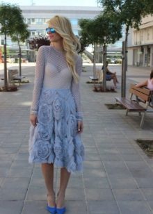 To attract attention to the legs, it is worth choosing blue shoes with original decor. For example, beautiful guipure inserts.