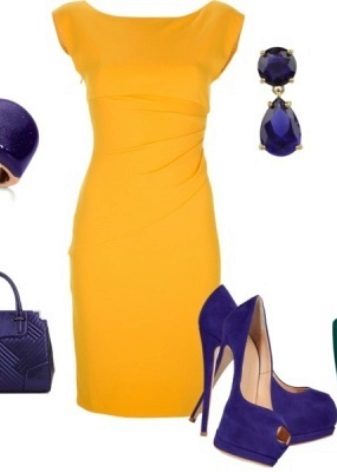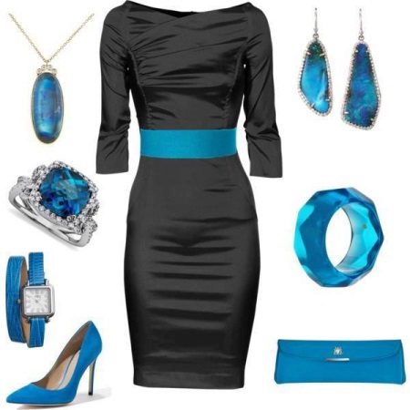 For an elegant evening look, stylish shoes of any shade of blue harmoniously look with things or accessories of a yellow shade. A black dress in tandem with bright blue shoes looks very elegant and harmonious.