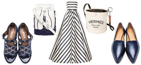 Blue shoes are a good option for a hot summer, as they are perfect for embodying a stylish look in a nautical style. With lacquered slippers of saturated blue, green cropped trousers and a white t-shirt with a blue horizontal strip look harmoniously. On top you can wear a jacket to match the shoes. A stylish white and blue small handbag will perfectly complete the summer look.