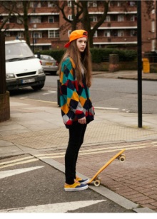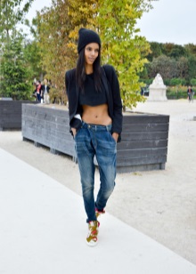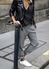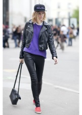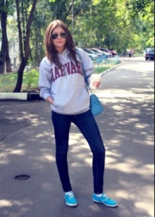 And here is the star of sports shoes - sneakers that look perfect in this image. Jeans, gray Velcro sneakers, a cropped urban-style coat, a hat are an example of how to wear athletic shoes. This image attracts the eye, although it is simple.
