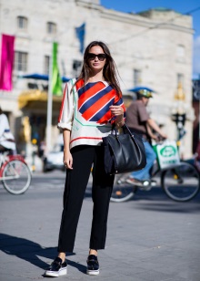 Bright sneakers with a wedge, for example, in orange or slip-ons in colors, or maybe striped or with stars, will be relevant.