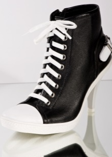 - Sport-type shoes with heels are truly extravagant and extremely original. Heel height rarely exceeds 8 cm, and more is not necessary, in fact. The heel may be studded or thick and firm. In principle, the shape of the heel is not as important as its presence.