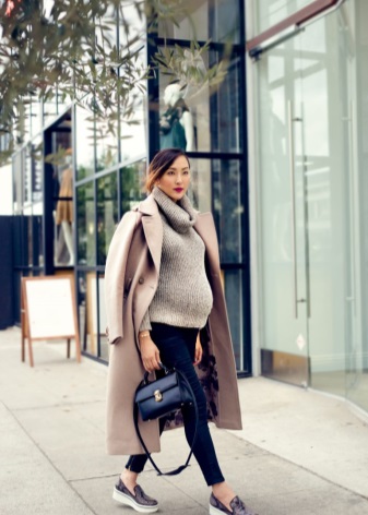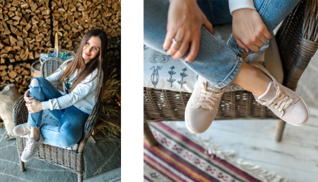 The main accent of this image is beige thick-soled sports shoes with laces. Although their design is simple and nothing stands out, the character of this image is set precisely with the help of shoes.