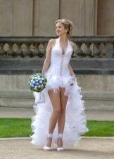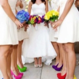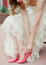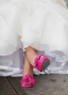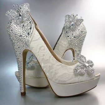 Girls who prefer the most extravagant and unusual can turn their attention to avant-garde models with an unusual shape of the heel, wedges, transparent heels, bright decor, etc. Such models are most often combined with mini or midi dresses, otherwise such original shoes will simply be lost in the lush folds of the bride's dress.