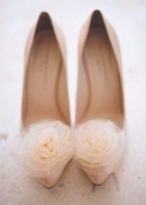 In the first place as a decorative addition or print is a floral ornament. Small or large buds of delicate roses, peonies or lilies can often be found on the shoes of the bride. This is not surprising. Flowers are always associated with the most festive and joyful events of our lives. Flowers can be done in the tone of the shoe or be contrasting.