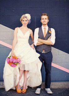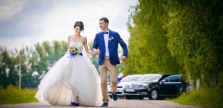 When choosing colored shoes, it is necessary that they are ideally combined with the color of the dress, otherwise the image risks being disharmonious. A dress or a wedding suit can be snow-white, in this case, in the toilet should be some detail to match the shoes: a living decoration of flowers, a belt, a handbag, decor elements, jewelry, or a bride’s bouquet.