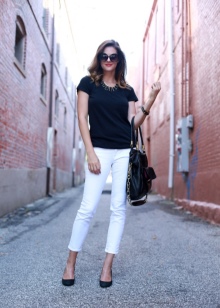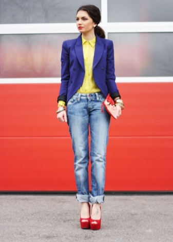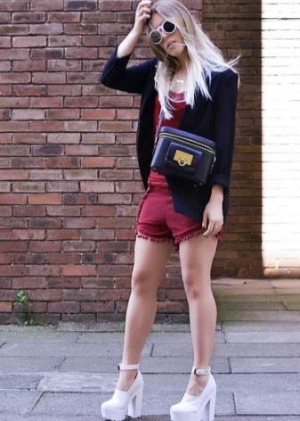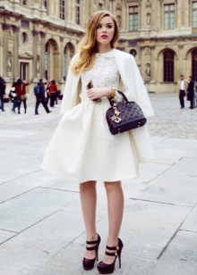- Sexy and at the same time simple look: a red tight-fitting mini-dress is complemented by a snow-white jacket with a 3/4 sleeve and white shoes with a high thick heel and an ankle strap. As accessories, large golden jewelry will do.
