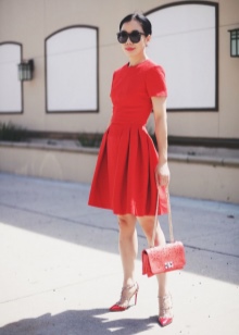 - Luxurious outfit, suitable not only for every day, but also for an evening out. A light blue blouse, combined with a red skirt, cut to the sun, knee-length. A great addition to this outfit will be lacquer boats in a beige shade.