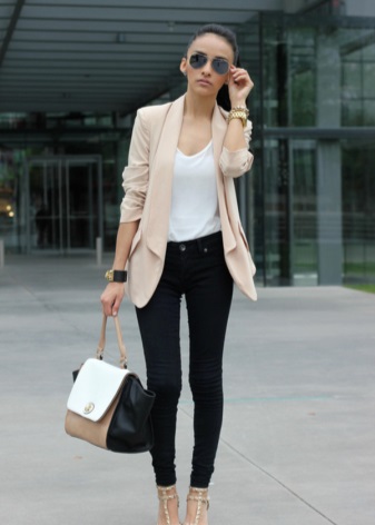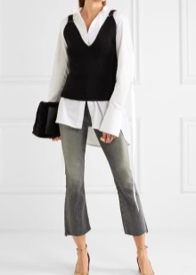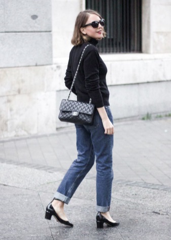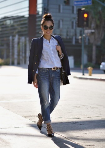 Themed decor, echoing the spikes of the models, harmoniously complement the image. It can be found in the design of bags or eyeglass frames. Models of a dark smoky color with small spikes along the entire length of the straps complement the set of a fitted jacket, black blouse and skinny jeans in blue.
