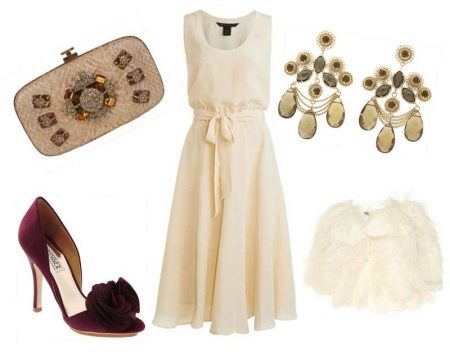 Luxurious satin high-heeled sandals make the leg visually slimmer. An interesting color scheme of this ensemble is a combination of two shades: a dress is a dress of light beige with shoes of a more restrained color of ripe cherry. Sandals are decorated with a large flower. The evening toilet as a whole looks glamorous and elegant.