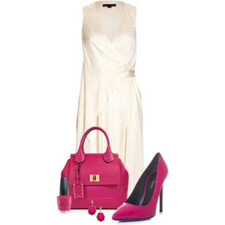 In a romantic image, which creates a snow-white flying satin dress, shoes with a closed cape add a touch of sexuality. Romantic saturated pink color of shoes in harmony with a white outfit. High heel makes the shape of the legs more perfect.