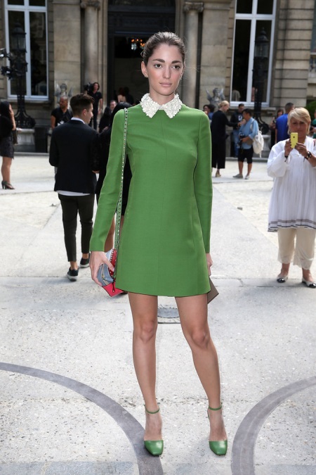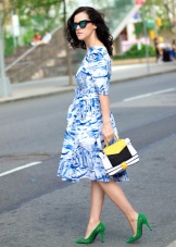 - Almost monochrome image, made in the shade of asparagus. A short a-line dress with a white collar and fashionable shoes with a jumper on the ankle. A stylish look for publication is diluted with a multi-colored handbag on a long strap.