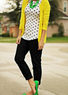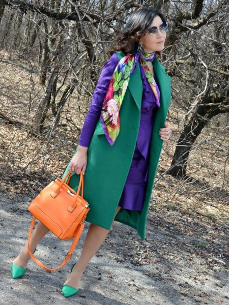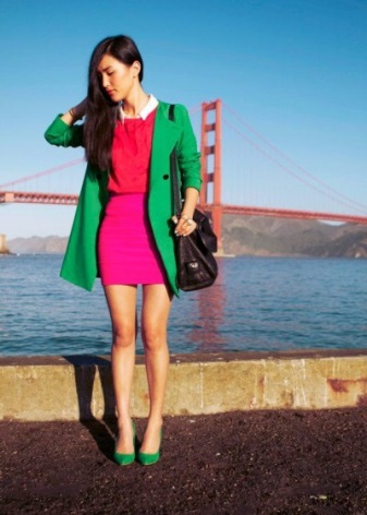 - Everyday images made using the color block technique will look original. You can combine green shoes with plain clothes of pure spectral colors. For example, with red trousers and a yellow blouse.