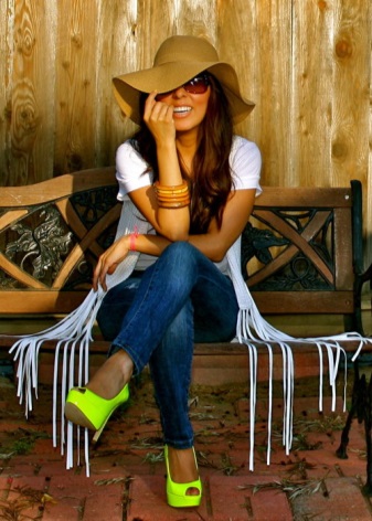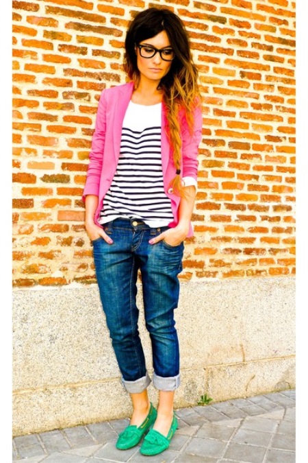 - Look in casual style is better to complement with flat shoes. Wear them with tucked-in blue jeans and a vest. To ensure that the look does not look boring, complement it with a bright pink blazer and large horn-rimmed fashion glasses.