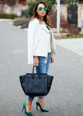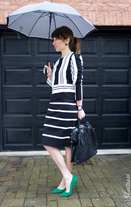 - A great example of how to successfully fit green boats into a business wardrobe. Wear them with a black and white striped suit consisting of a long sleeve blouse and a pencil skirt. Complete the look with a capacious black bag, watches and minimalist jewelry.