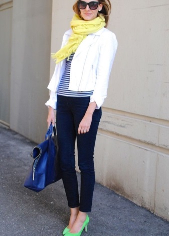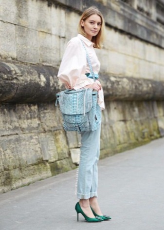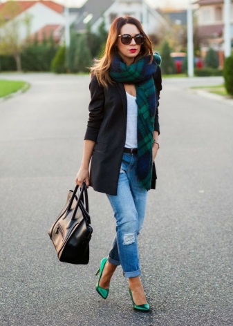 - For a casual get-up, there is nothing better than a combination of jeans and showy suede pumps. Jeans style can be almost any, the best would be blue ripped boyfriend, black skinny or mom-jeans with high waist. The blouse and jacket or blazer of a neutral shade will complement the image.