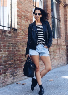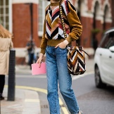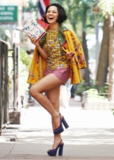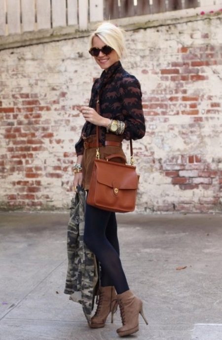 Very advanced, but at the same time, a cute image will help to create autumn shoes with a closed stiletto heel. Most interestingly this model looks with shorts. If it seems to you that your image is not extravagant enough, you can add tights of an unusual shade, for example, blue. A sweater with a collar, decorated with ornaments, will help to justify the color scheme. Pay attention to accessories. Several bracelets on the hands will complement the image well.
