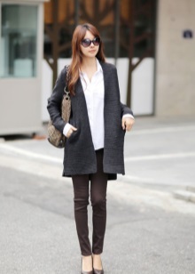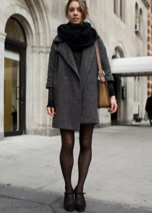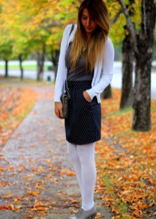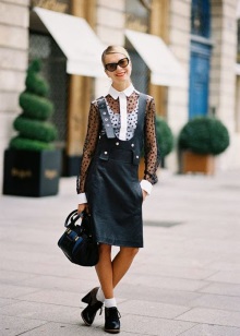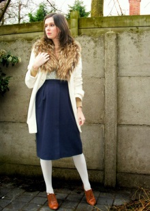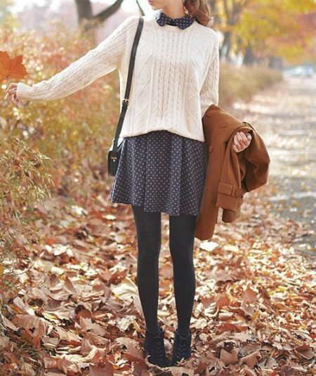 Typically youth image for autumn weather. Closed shoes of dark color do not stand out very much and look laconic with an outfit from a shirt and a shortened sweater. A loose skirt and dark tights will add femininity and elegance, as well as emphasize the harmony of the legs. Complete the image of a coat or cloak in a contrasting color.
