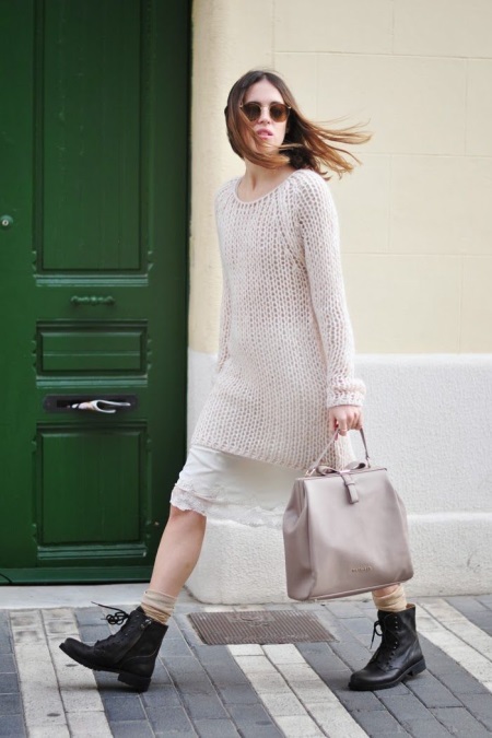The image of a feminine dress and a wide-cut sweater with massive boots is no less stylish and attractive. This will complete your look.