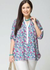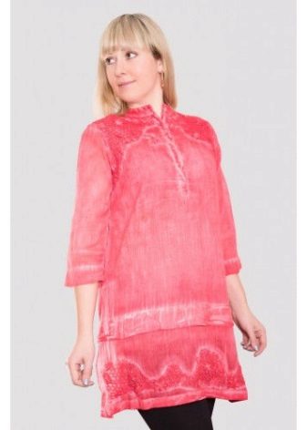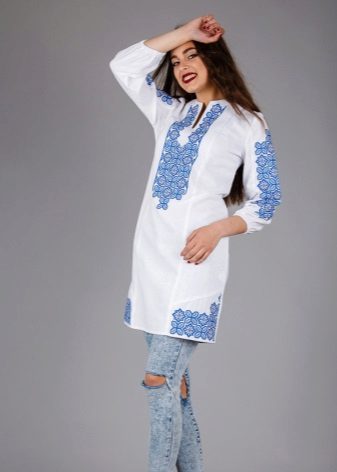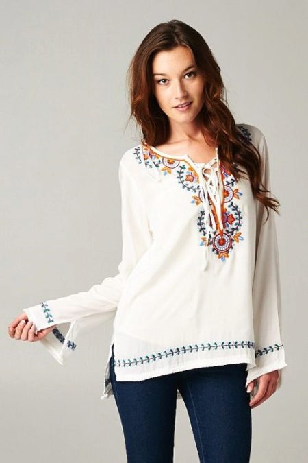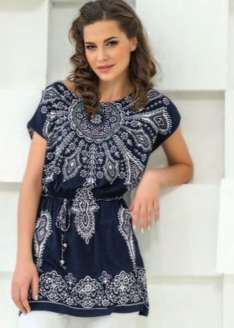 - Tunics in ethnic style. This trendy thing is distinguished by a printed print or embroidery. Such texture emphasizes the refined taste of its owner.