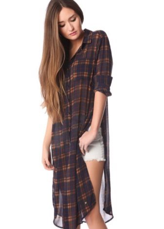 Summer long tunic and shorts are just made for each other. It is not hot and comfortable, it flies in the wind, giving freedom to its owner. Sandals or sandals on a high platform, a shoulder bag and a hat will make an image complete.