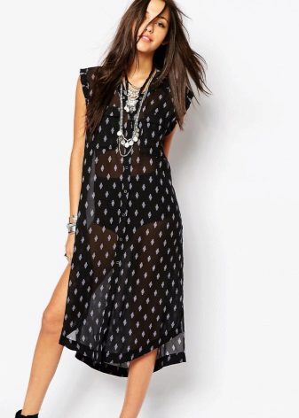 - Long tunic to the floor. They are luxurious, create a weightless and flying image. Able to replace the dress, good for an evening out, or as a cape on the beach.
