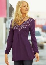 Straight plain tunics are popular this season. They can be decorated with an asymmetrical hem or small cuts on the sides. These models can be safely combined with vests, jackets, sweaters or jackets. Many models are decorated with embroidery or ethnic prints.