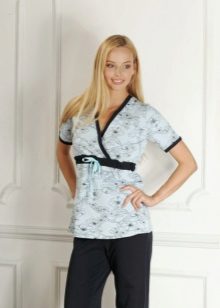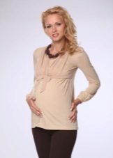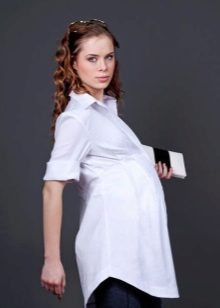 Girls prefer to wear a tunic shirt to work in the early months of pregnancy. When choosing a color scheme, you can focus on the classic white color or diversify the stylish bow with color models. To hide your position from others, you should buy a model with a dark smell.