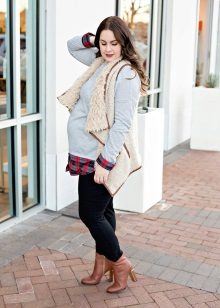 For every day, the tunic can be combined with jeans for pregnant women who have elastic in the abdomen. Jeans can be both narrowed and straight cut. An elegant neck scarf or a beautiful handbag will complement a stylish bow.