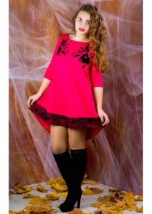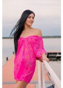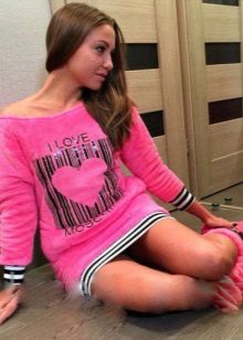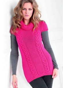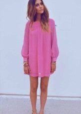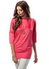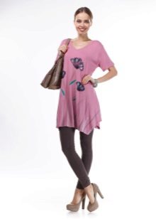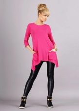 - An elongated tunic of saturated, deep pink color can be worn like a mini dress. In this case, you need to pick up shoes of a classic color, for example, black, white, beige or the same shade as the tunic itself, and so that it is not too defiant it can be combined with black lossins.