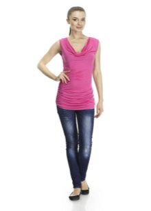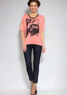 Jeans, shorts, bicycles, sweatpants, leggings, breeches, etc. are ideal for a pink t-shirt tunic or a straight, concise cut model. Flat shoes — sneakers, sneakers, ballet shoes, moccasins — are best suited to this look, and heels will look stylish in some cases.