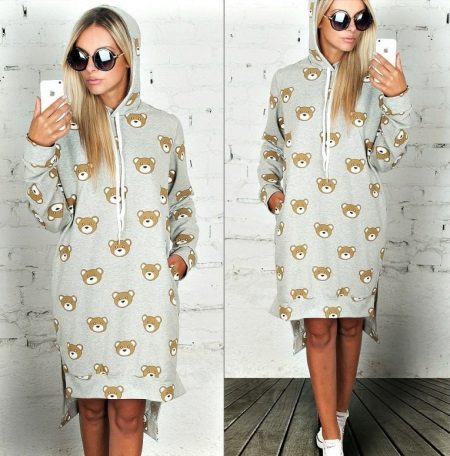 There are maxi models to the ankles, which organically look with hoods. Differences in different styles can also consist in the length of the sleeve (its complete absence, three quarters, to the palm), the shape of the neck (with or without a collar, round or v-shaped).