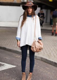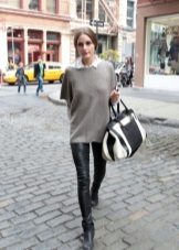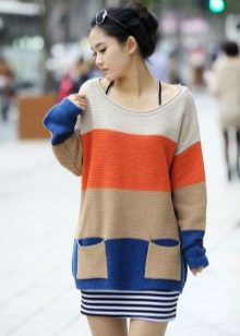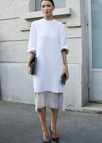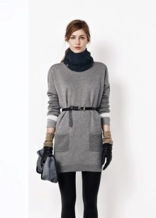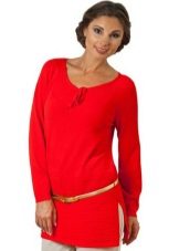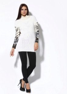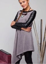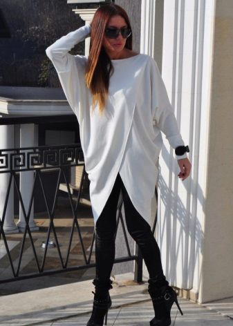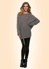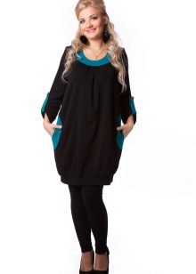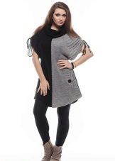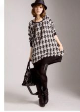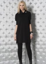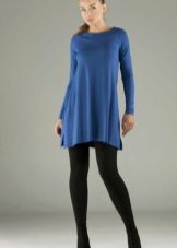 The most common option is with leggings and leggings, best of all black. Tight jeans will also be in place. Another good option is tight tights, preferably not cotton. You can create a business image with a combination of a plain monochrome tunic with black trousers or a pencil skirt of contrasting color. Leg warmers in the color of the product will make an excellent company tunic elongated cut.