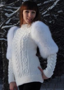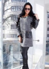 Modern fashionistas will not be indifferent to the decoration of winter tunics with fur, both artificial and natural. A warm woolen sweater tunic with fur pockets, a hood and fur pompons will look luxurious. To support the bow will help leggings and fur boots.