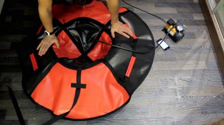 Thus, the inflatable sled will be ready for further use. Please note that when filled with air, the chamber may inflate unevenly. If during the pumping process any part of the chamber becomes more convex, you must press it with your hand or press down with your knee and continue to fill it with air. Such manipulation will help the rubber to swell evenly from all sides.