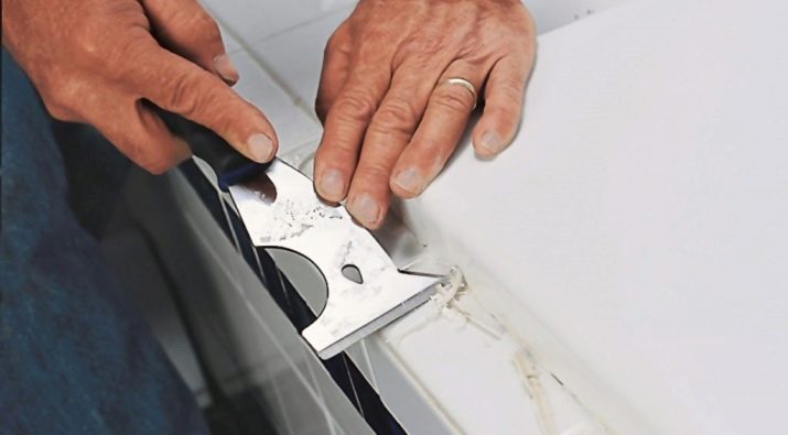 To remove the composition from the tile or tile, use stationery or construction knife. If you need to clean the joint between the bath and the wall, you can use a screwdriver.But if the sealant is not too old, then you can try to pry it anywhere: perhaps it has retained its adhesive properties and can easily be taken out of the recess with the entire strip. If there is no fear that the surface will be scratched, you can use a metal straight or angled spatula.