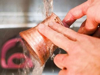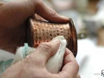 It is advisable to clean chemically pure copper sulfamic acidbut if there is even the slightest admixture, this substance will cause the product to blacken. After removing the dirt and thorough washing, drying will be required in a cool place. A combination of vinegar with salt and bran helps to remove dirt, it is simply applied to the surface and immediately wiped with a dry cloth.