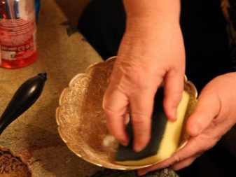 Antiques or heavily contaminated items should be put in a solution of salt and vinegar, brought to a boil and immediately removed from heat. When the liquid has cooled, the products are washed with warm, clean water and dried. Very dirty surfaces are rubbed with a cloth impregnated with hydrochloric acid of low concentration.