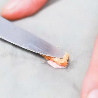 After removing dust from the upholstery, they begin to clean solid contaminants. Glued chewing gum, drops of candle wax or paraffin, traces of paint or nail polish are carefully scraped off with a sharp knife.